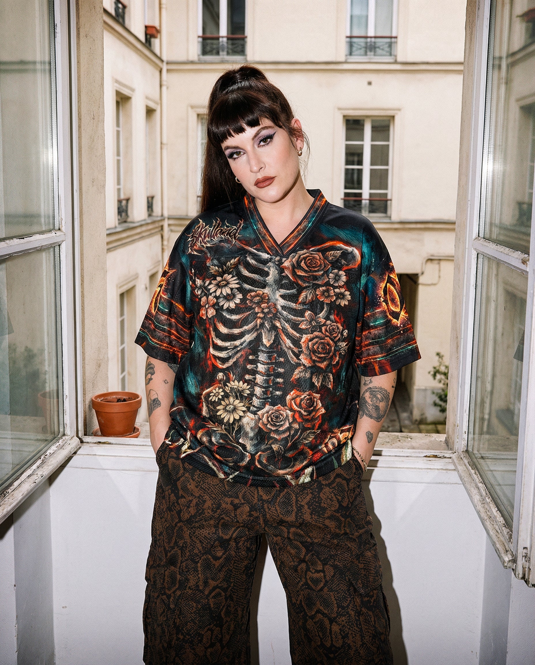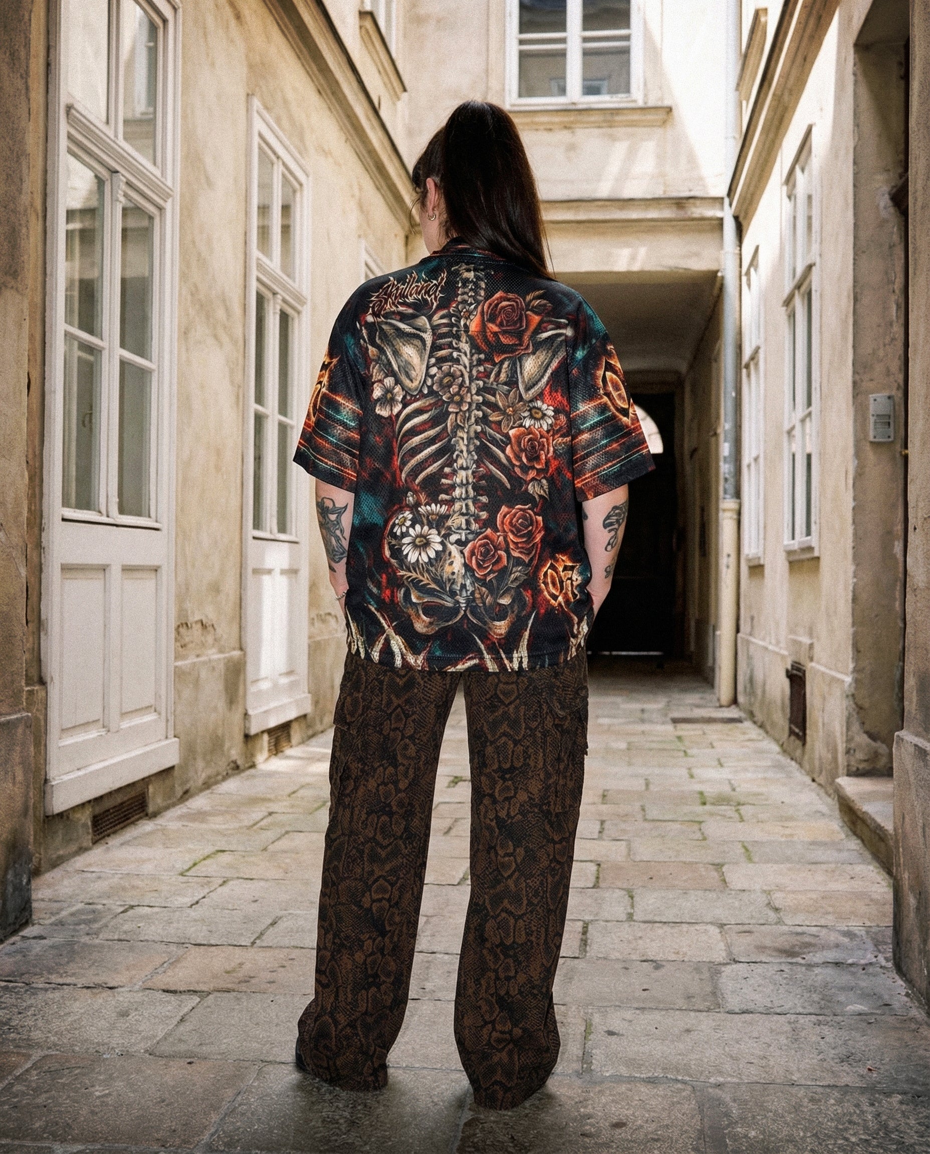 A bold fusion of life, decay, and rebellious beauty. This mesh jersey showcases a striking skeletal artwork intertwined with blooming roses and wildflowers, symbolizing the balance between mortality and growth. The detailed rib cage illustration flows across the front and continues seamlessly onto the back, creating a powerful full-body skeletal composition that feels both raw and artistic.