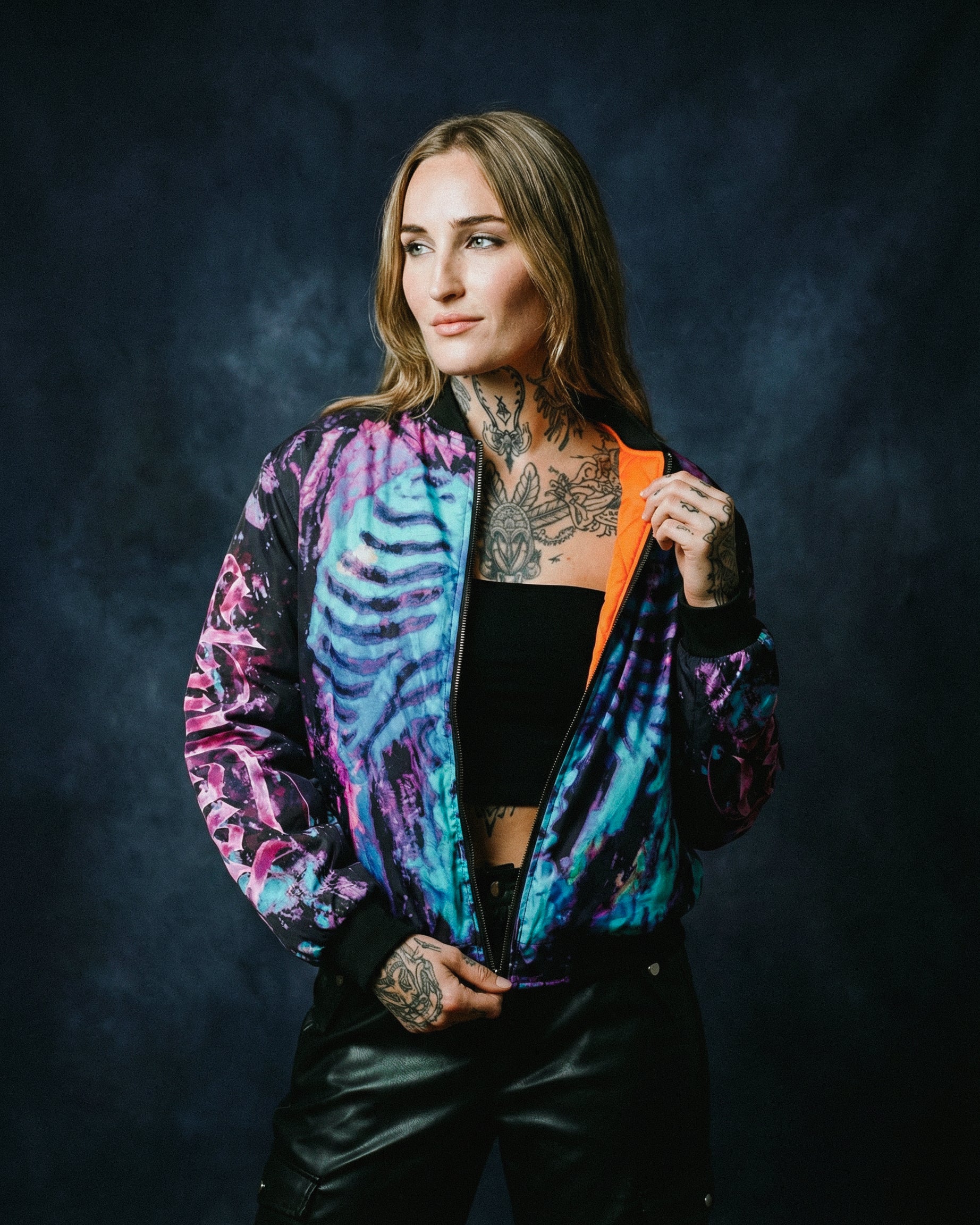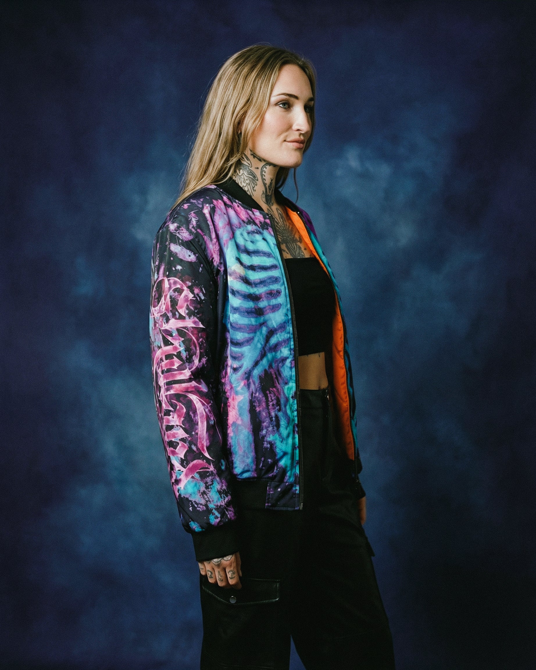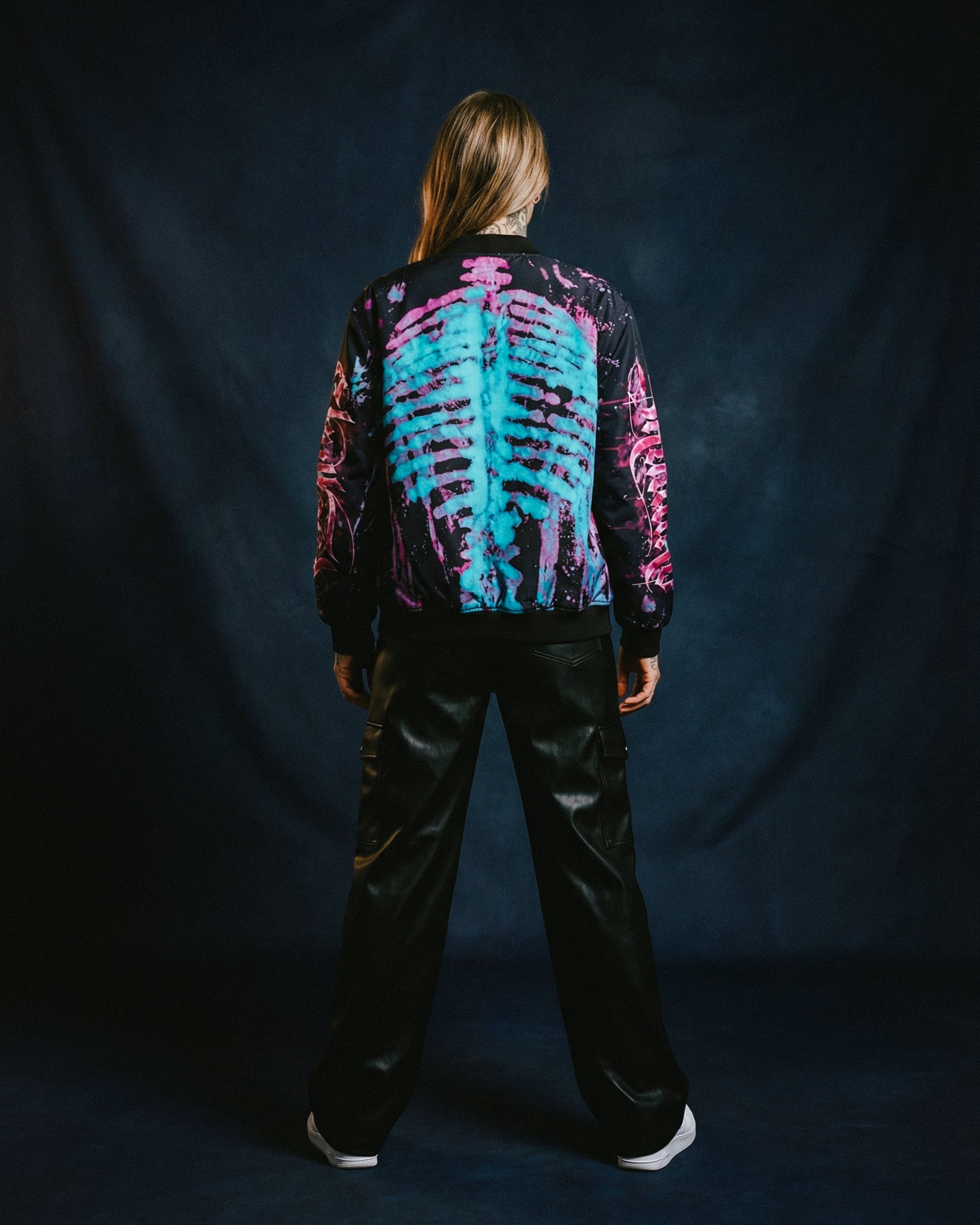Front and back explode with electric blue ribcage artwork layered over deep black, splashed with toxic pink and violet textures. It’s raw. It’s chaotic. It looks like it’s glowing in the dark.