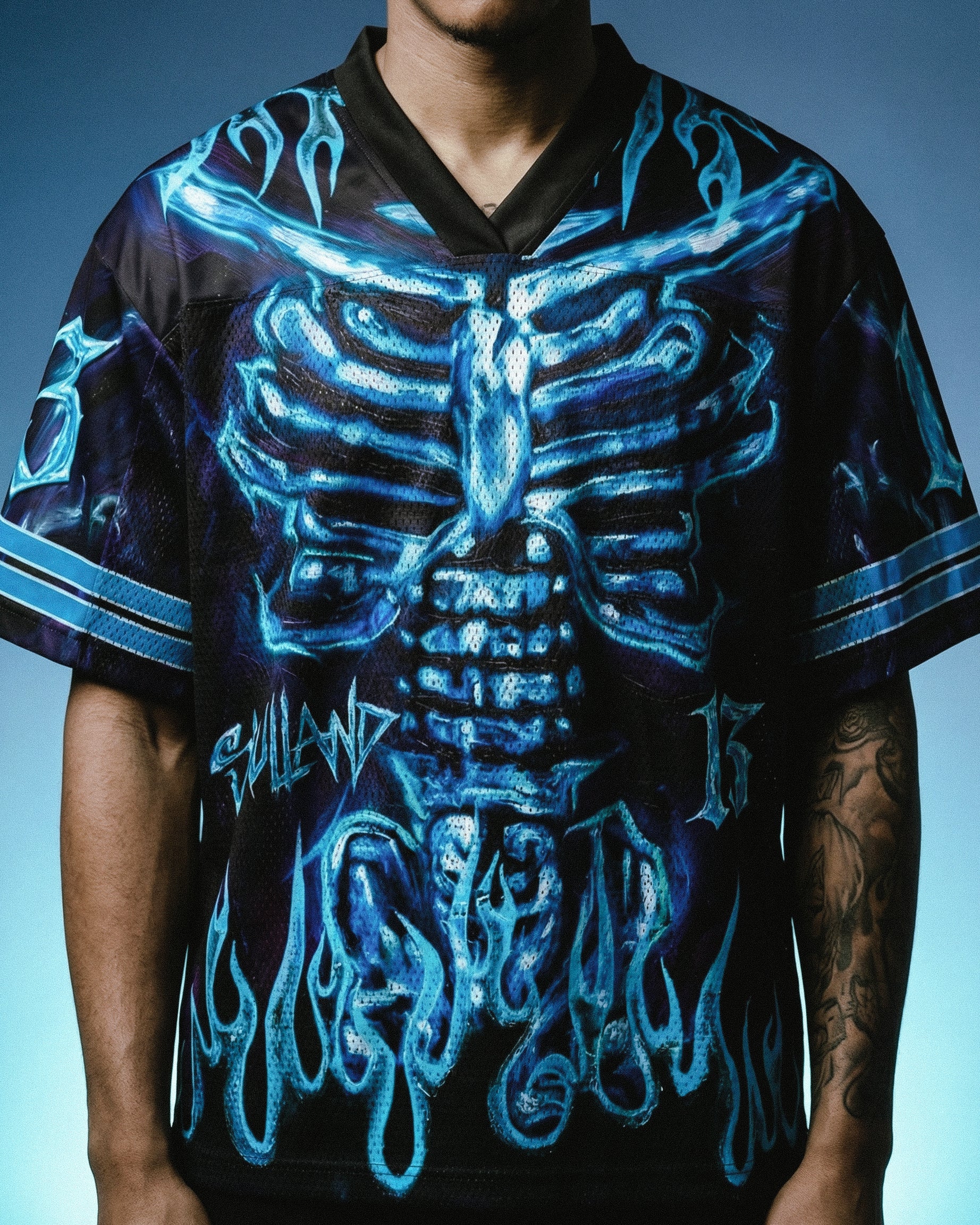 A bold Skulland design featuring a glowing blue skeletal ribcage on the front and a fierce demonic skull on the back, surrounded by electric flame-like graphics and dark neon tones. The intense artwork blends dark fantasy elements with a powerful streetwear aesthetic, creating a striking visual that instantly stands out.