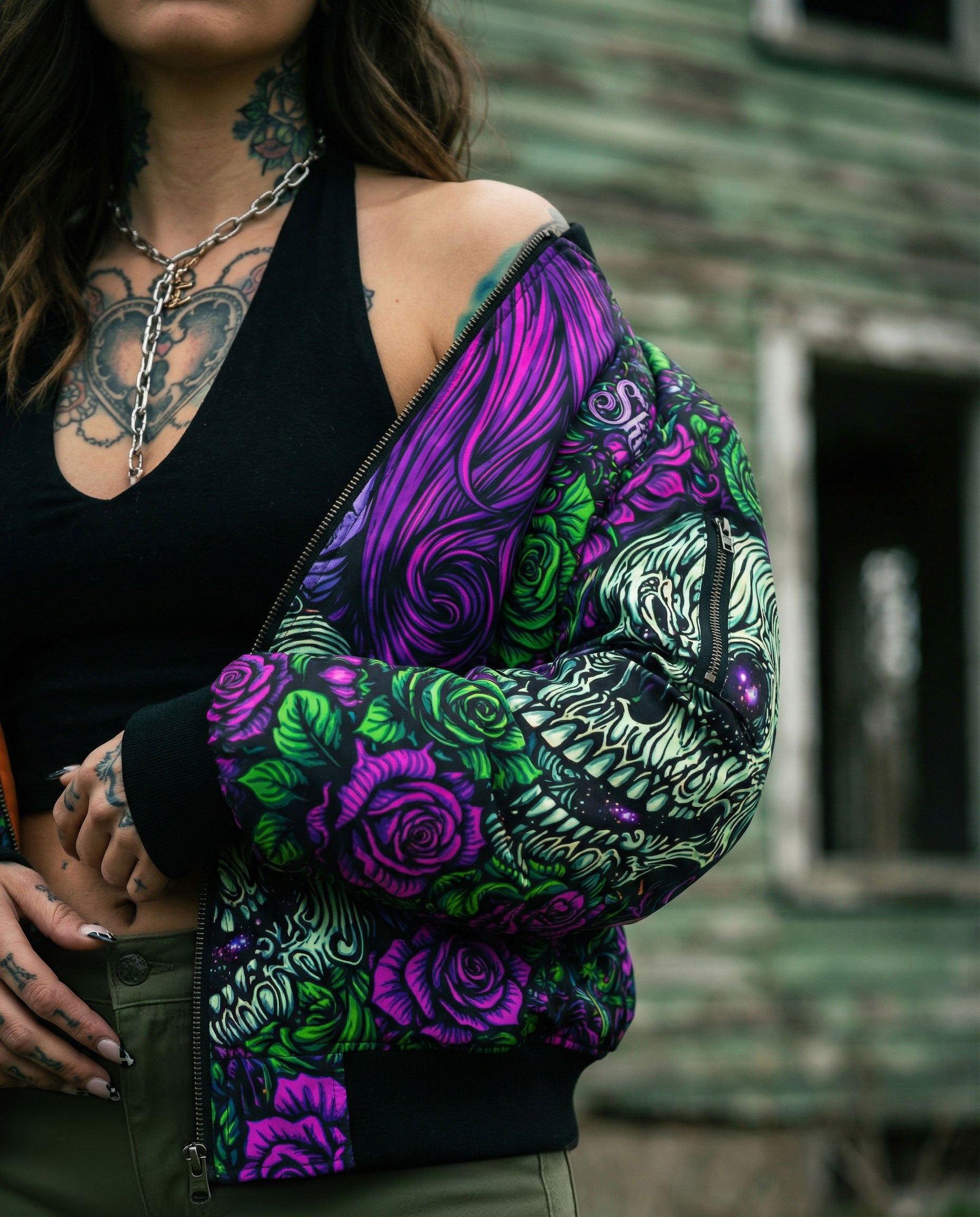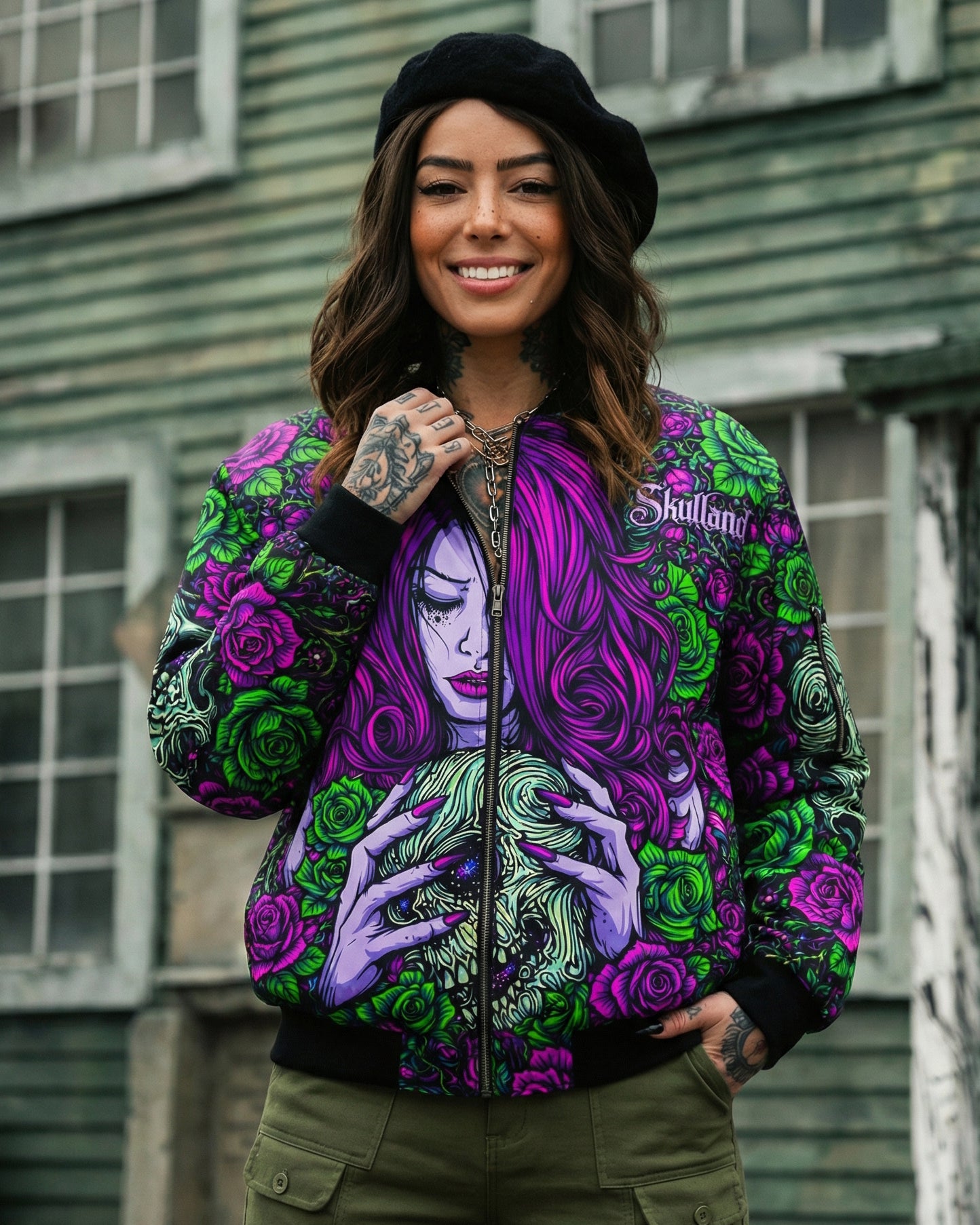 Purple hair. Neon roses. A girl holding a skull like it’s just another part of her story.