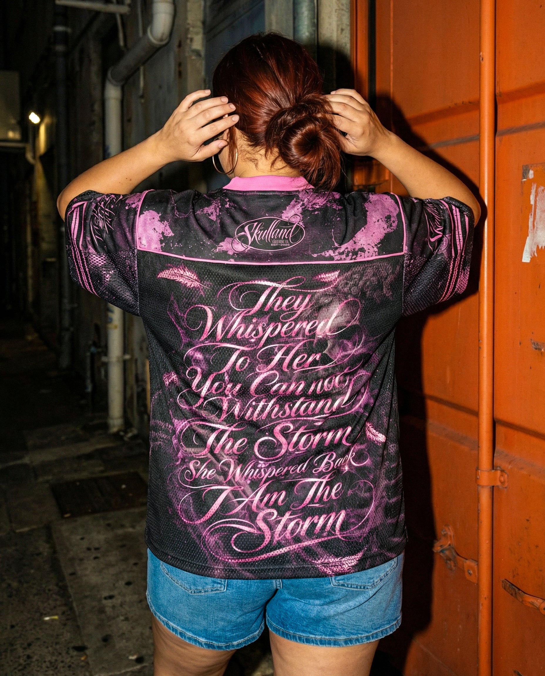Ready to wear the answer instead of the argument? The “I Am The Storm” Mesh Jersey is built around a line that doesn’t raise its voice — it ends the conversation. Against a dark mesh base, pink-toned graphics and flowing script turn a quiet exchange...