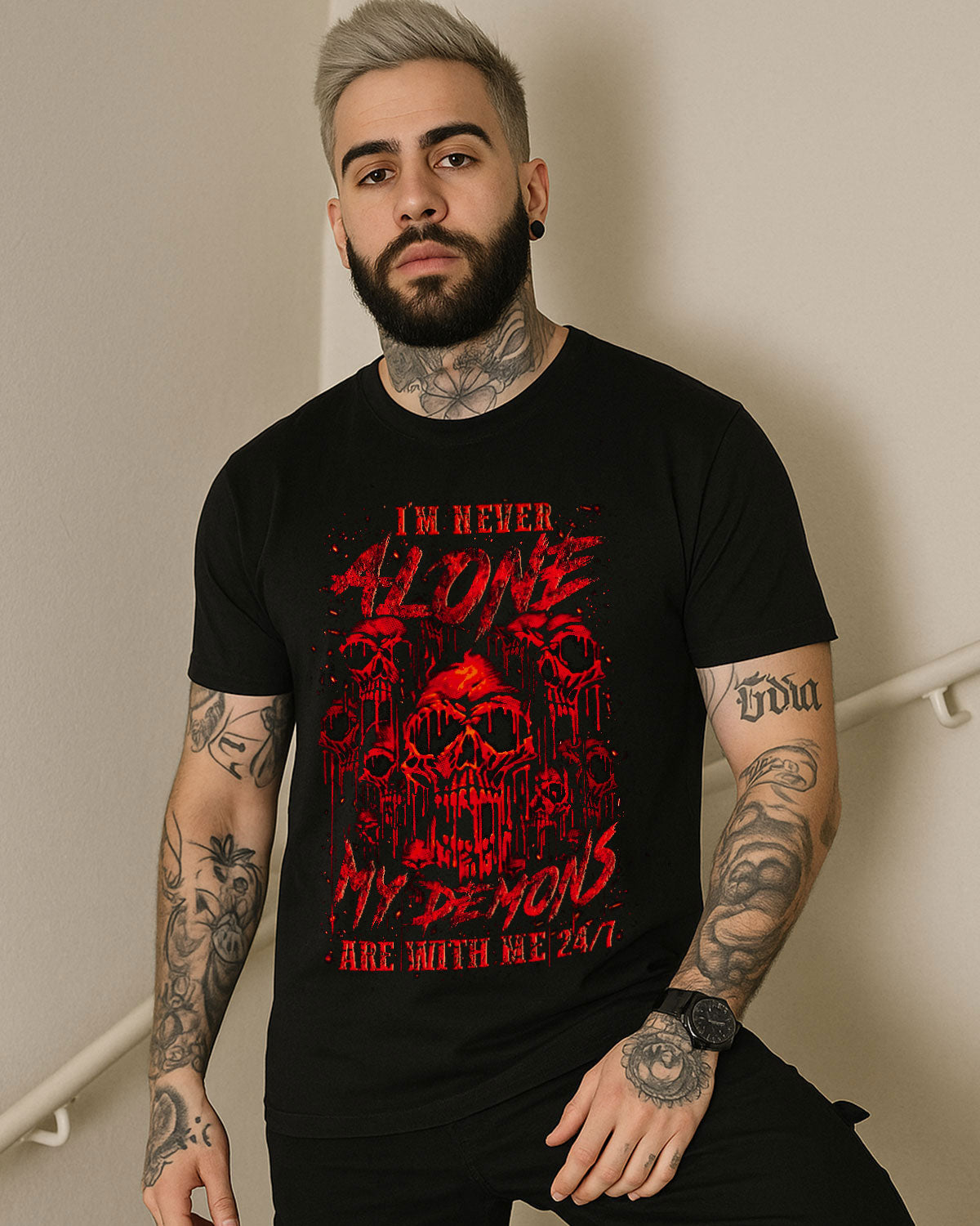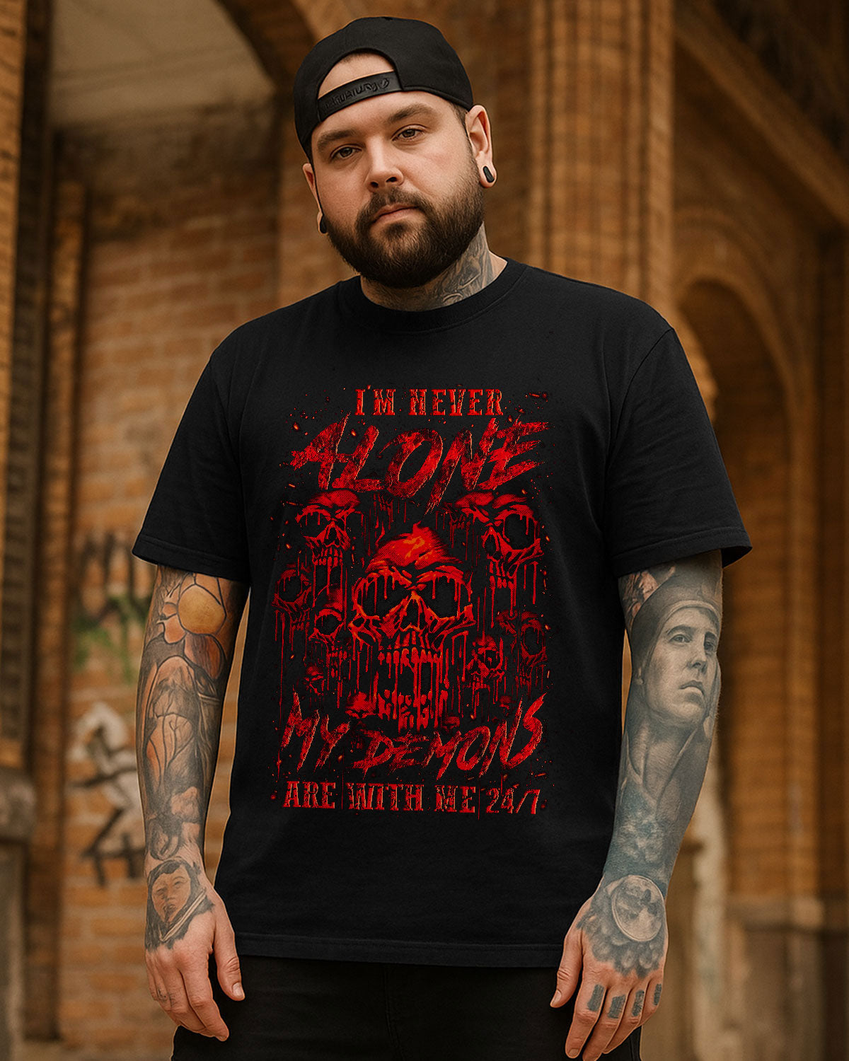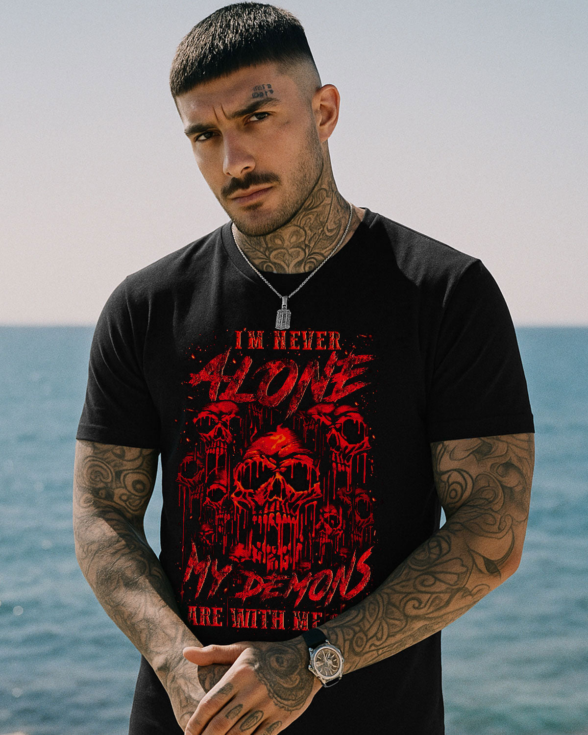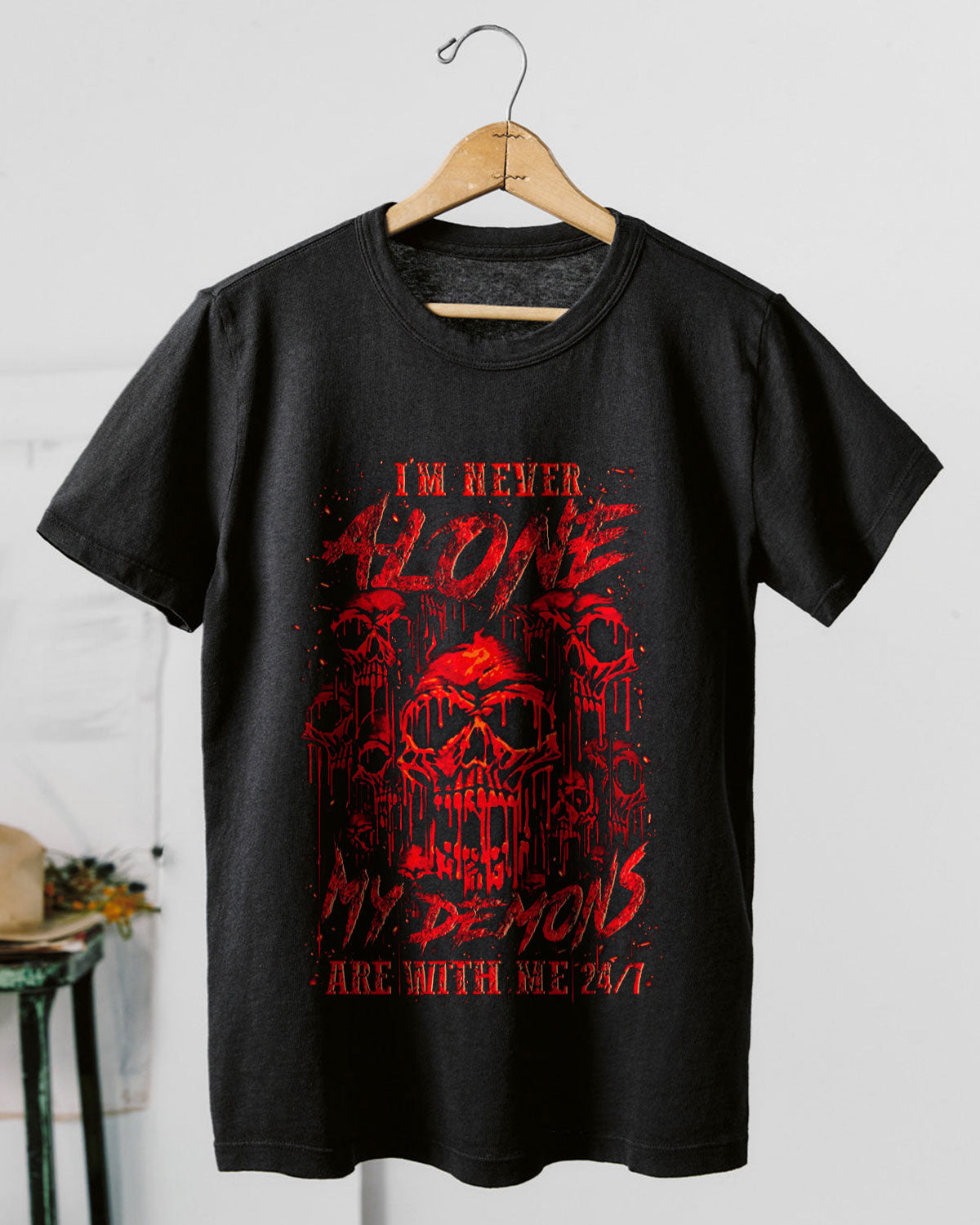 💀 I'm Never Alone — My Demons Are With Me 24/7 🌑⚡ A chilling, blood-red design featuring haunting skulls that radiate danger and darkness, crafted with eerie artistic detail. This quote is a raw truth for those who carry their battles within — not broken,...