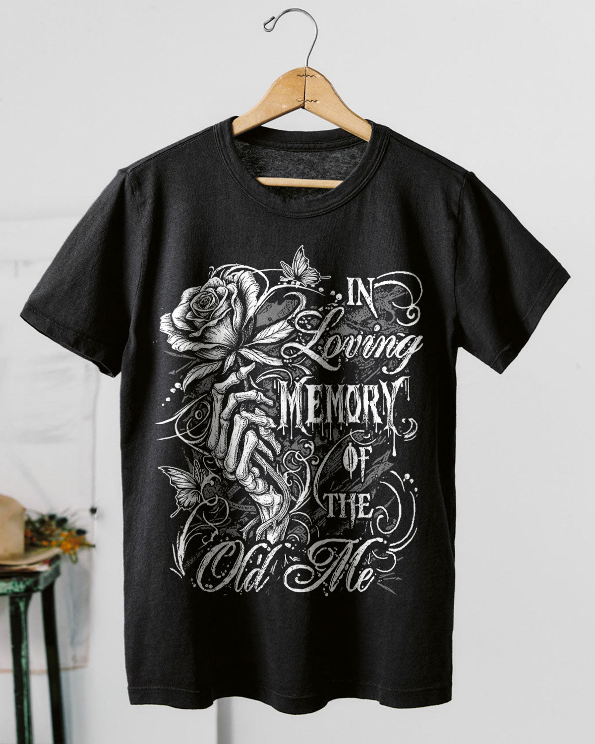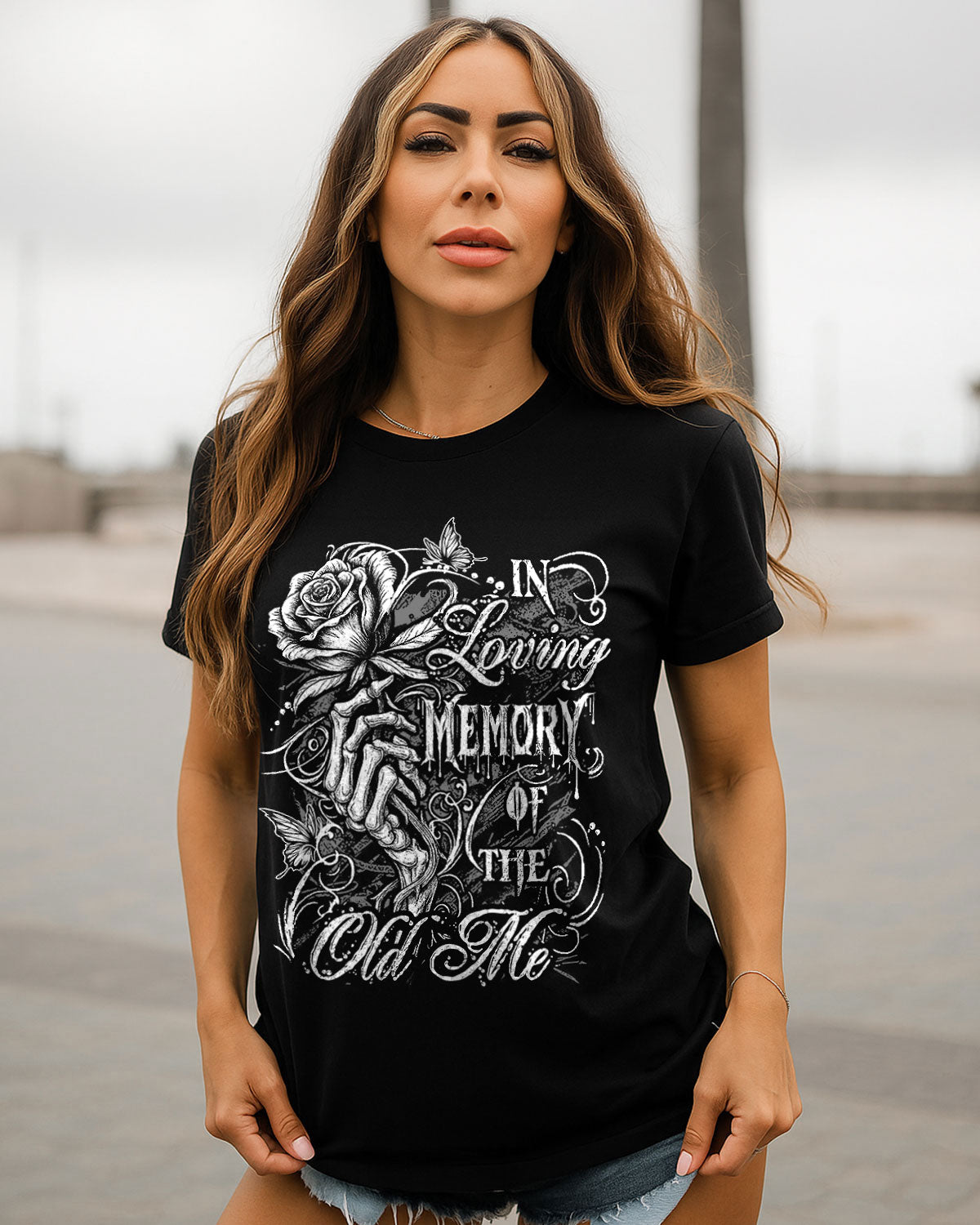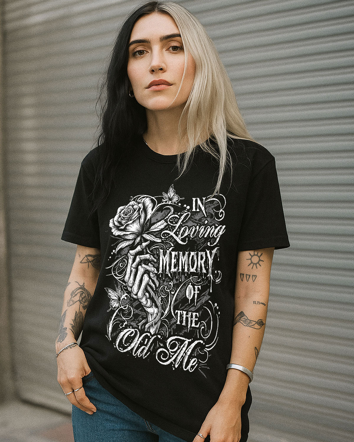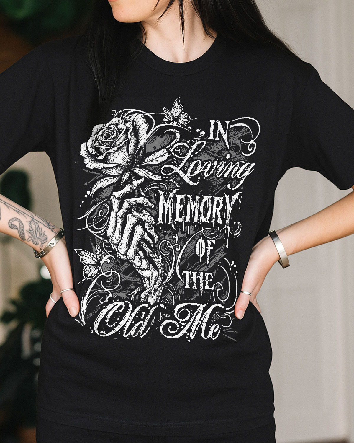 💀 In Loving Memory Of The Old Me 🌹🦋 This striking tattoo-style design features a skeleton hand holding a blooming rose, with butterflies resting and dancing around it — a powerful symbol of transformation and rebirth. It’s a tribute to the past self that was...