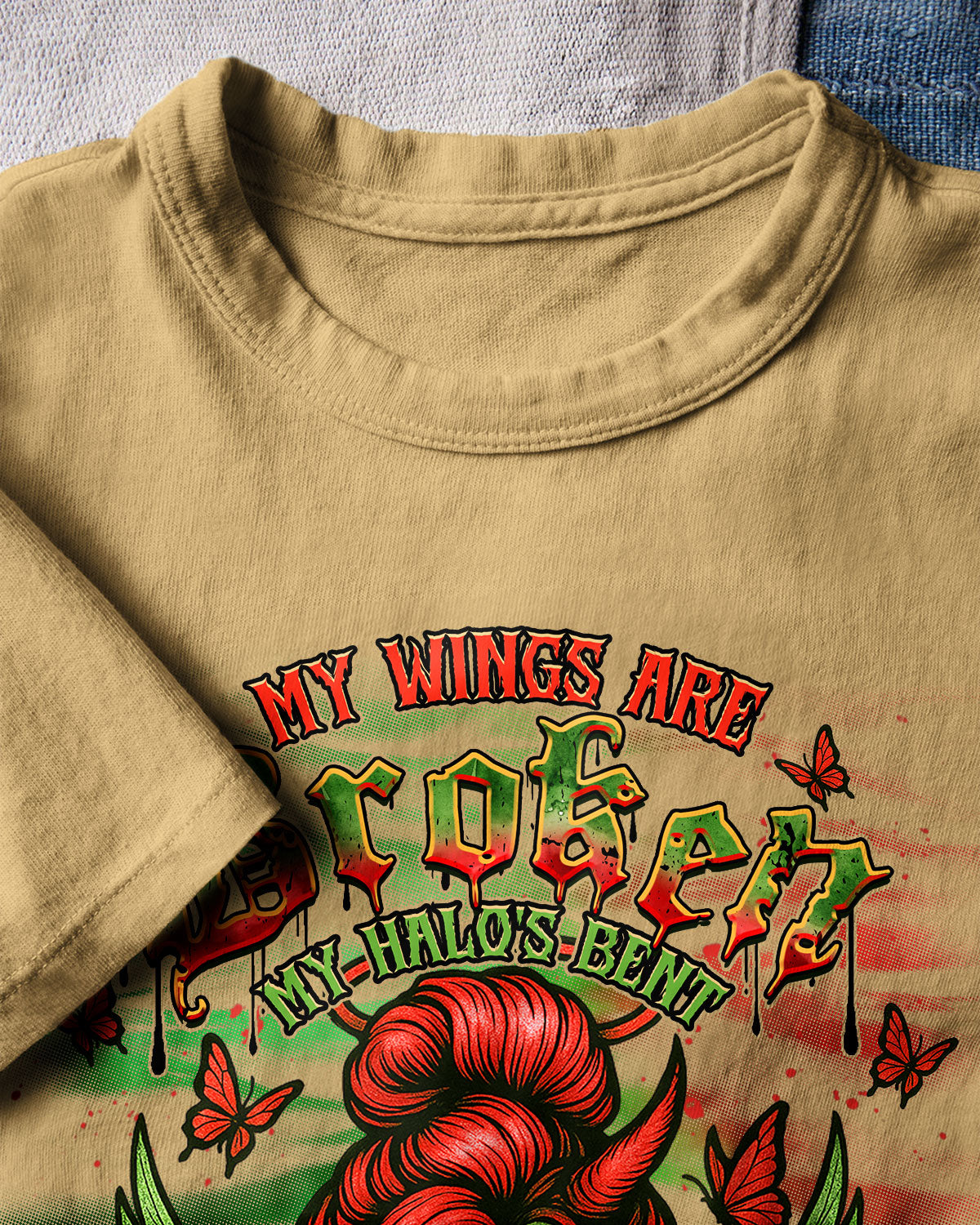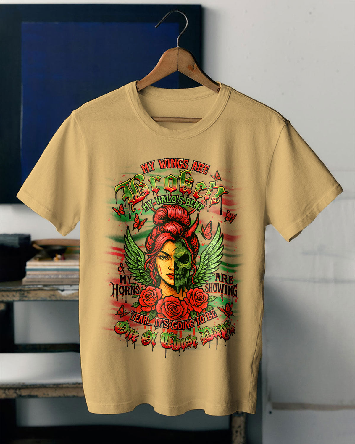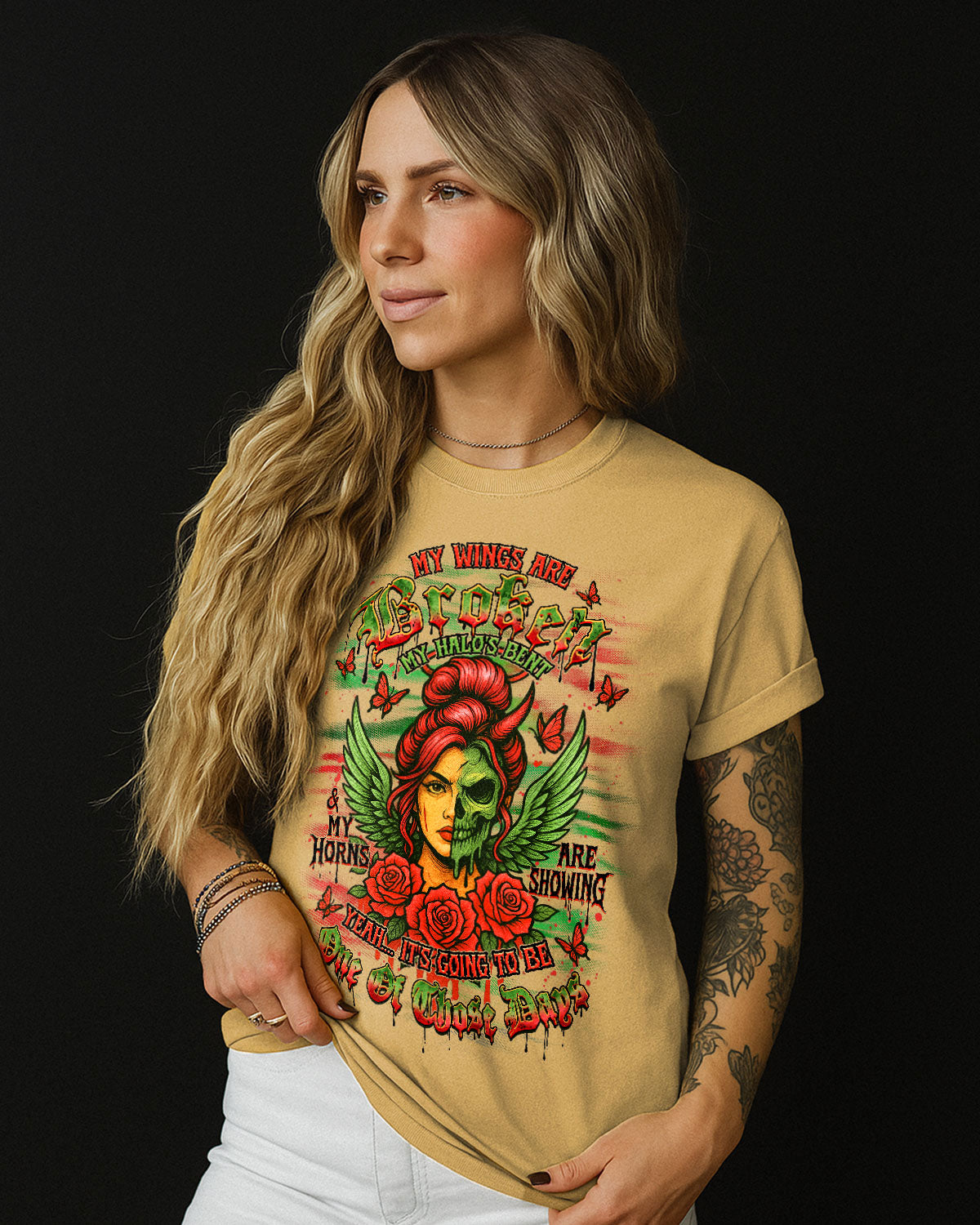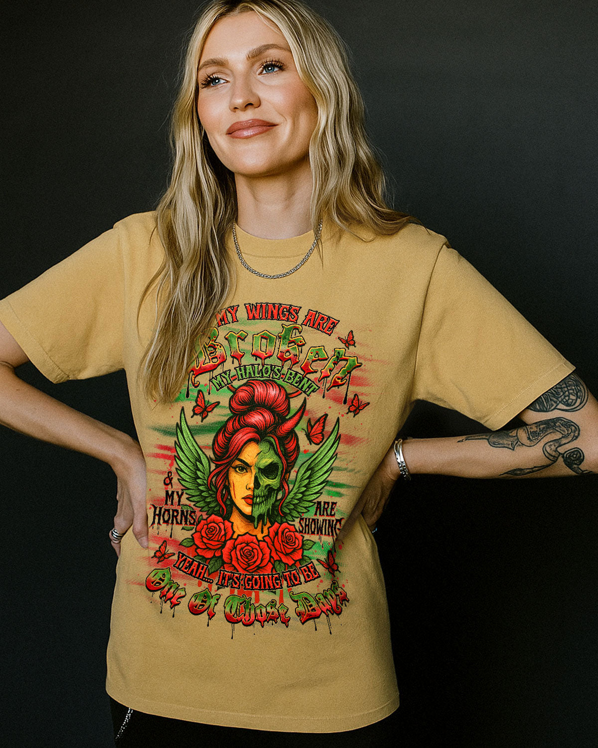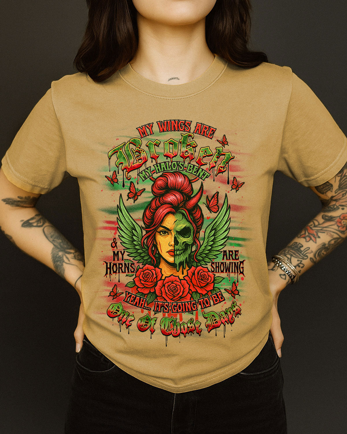 ๐Ÿ’€ My Wings Are Broken, My Halo's Bent ๐Ÿ˜‡๐Ÿ˜ˆ This powerful design blends beauty and darkness โ€” featuring a fierce lady with angel wings and a bent halo, half her face transformed into a skull with a wicked horn. Surrounded by roses, butterflies, and eerie...
