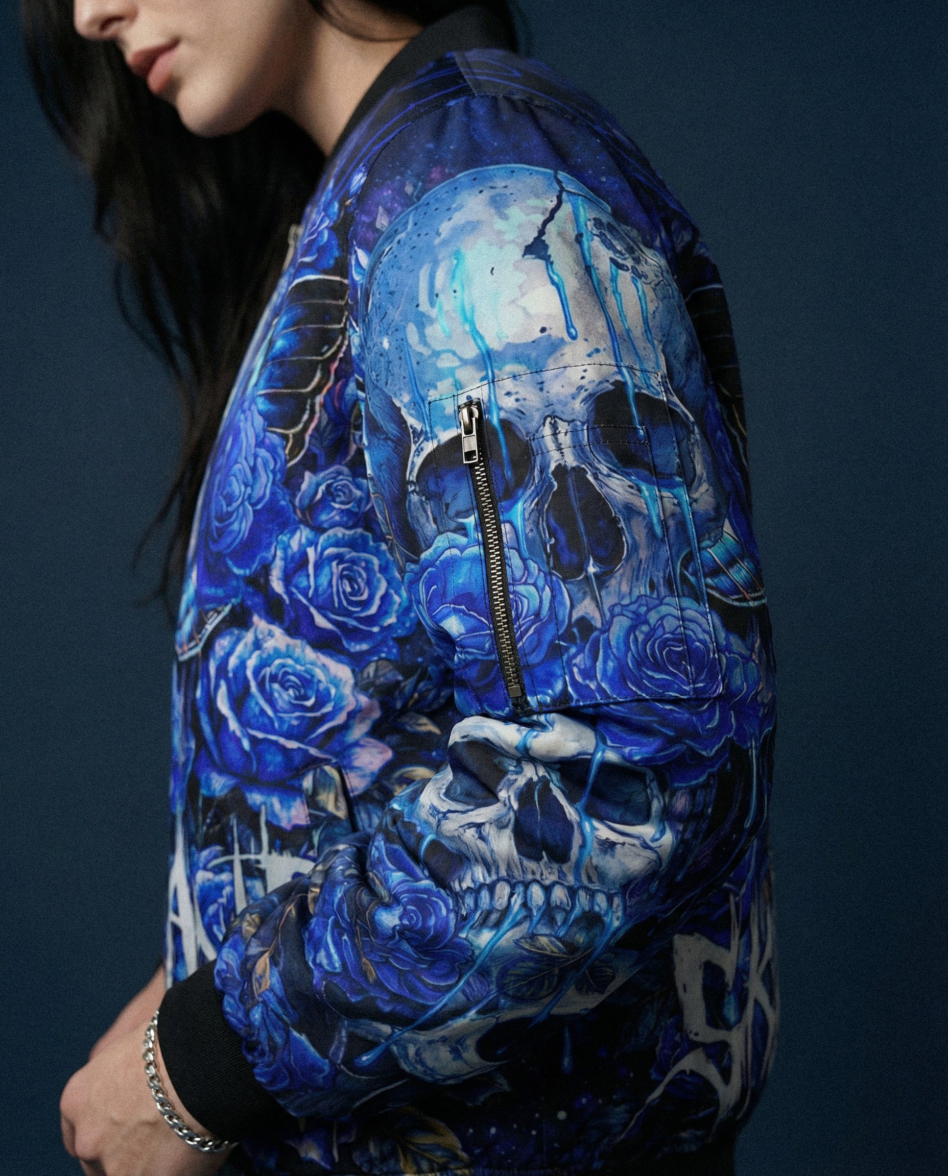 Deep blue skulls, roses everywhere, a butterfly spreading across the chest — it’s dark, but not loud in a cheap way. It’s the kind of piece people stare at for a second longer.