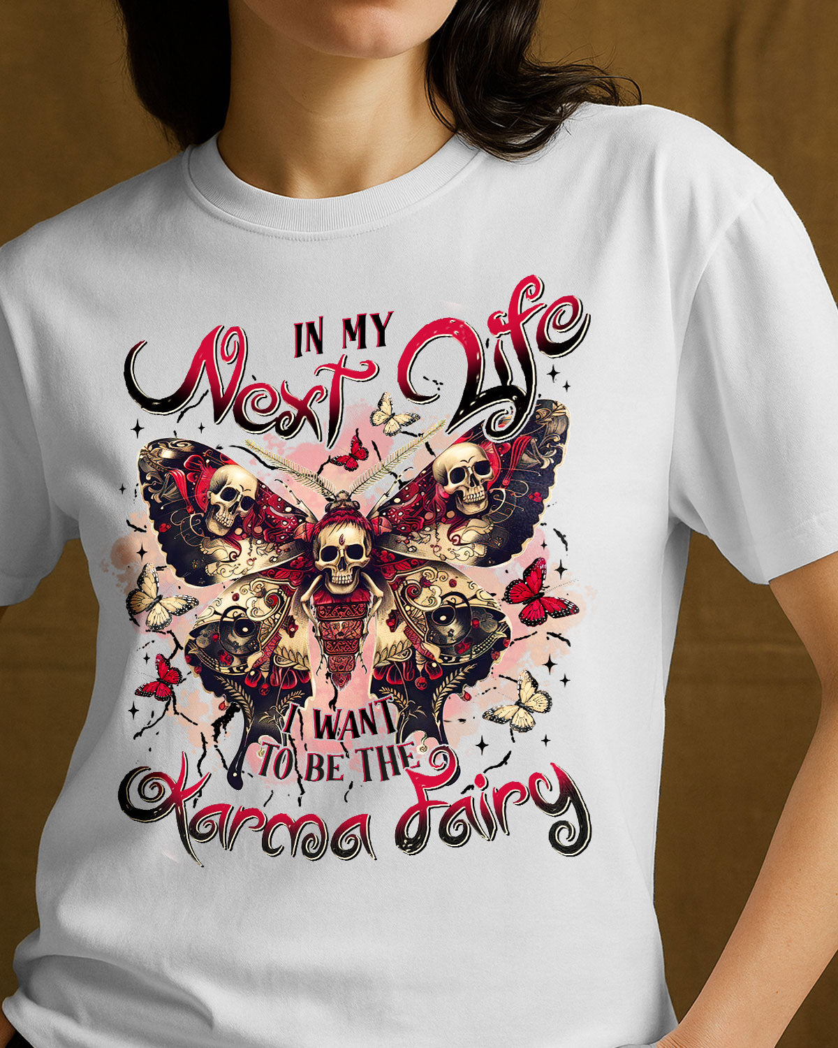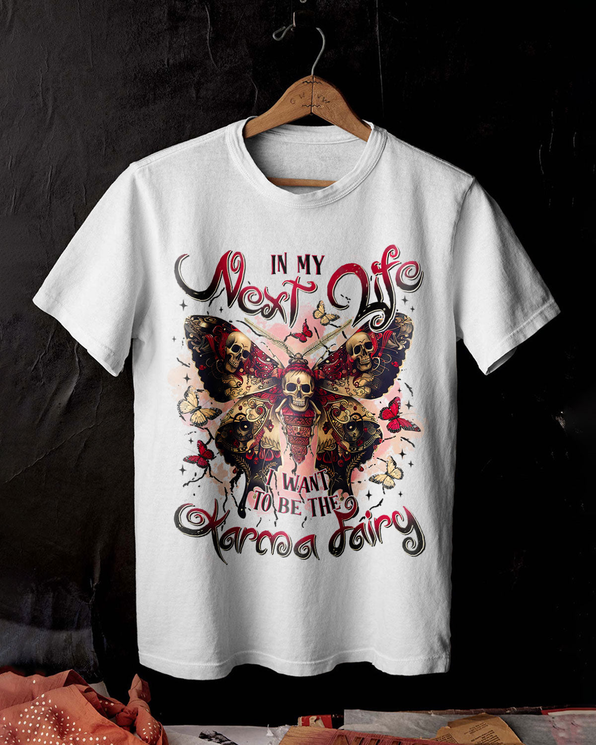 💀 🦋 In My Next Life I Want To Be The Karma Fairy 🦋 Step into a world where magic meets justice with our new ghostly butterfly skull design rendered in enchanting vintage hues. This hauntingly beautiful image blends delicate butterfly wings with a spectral...