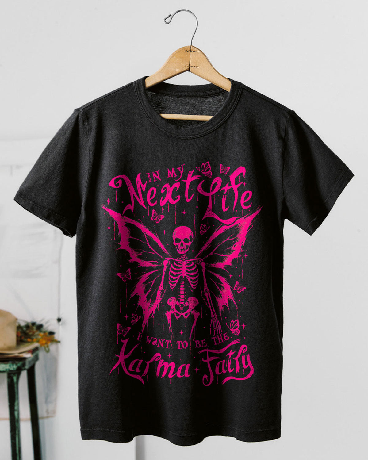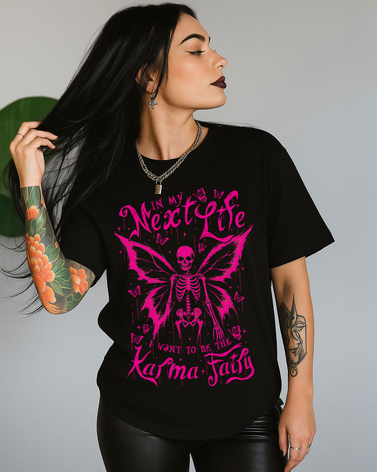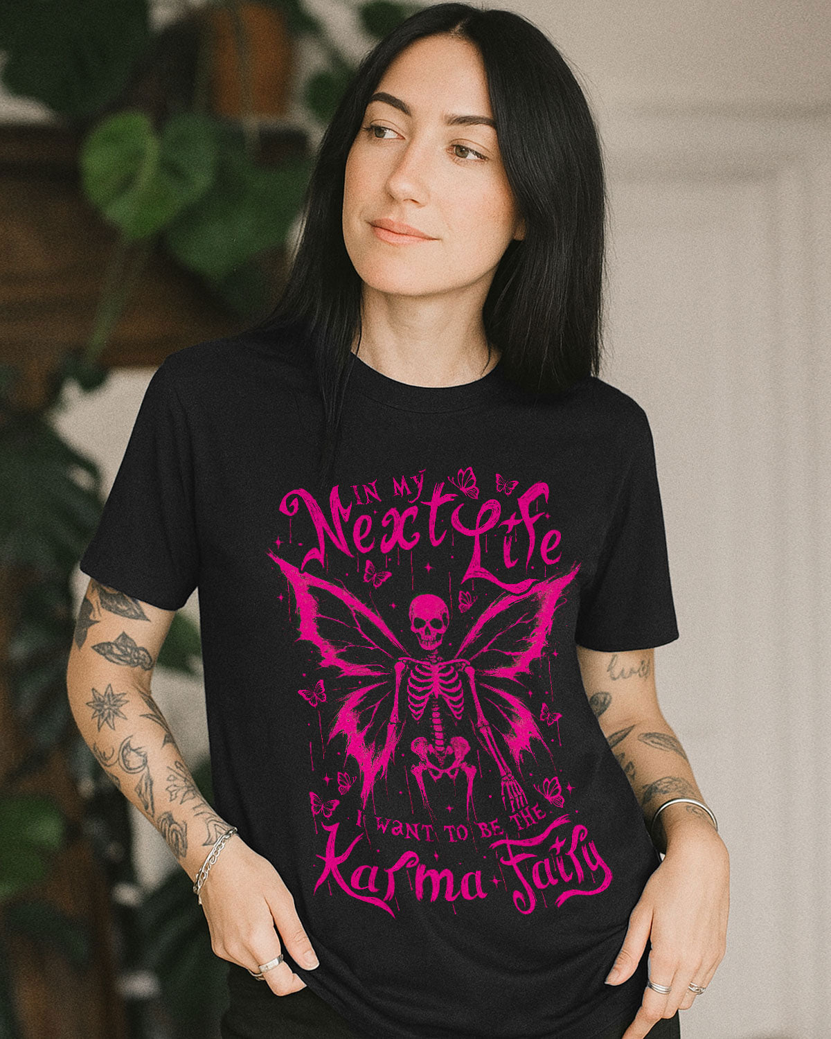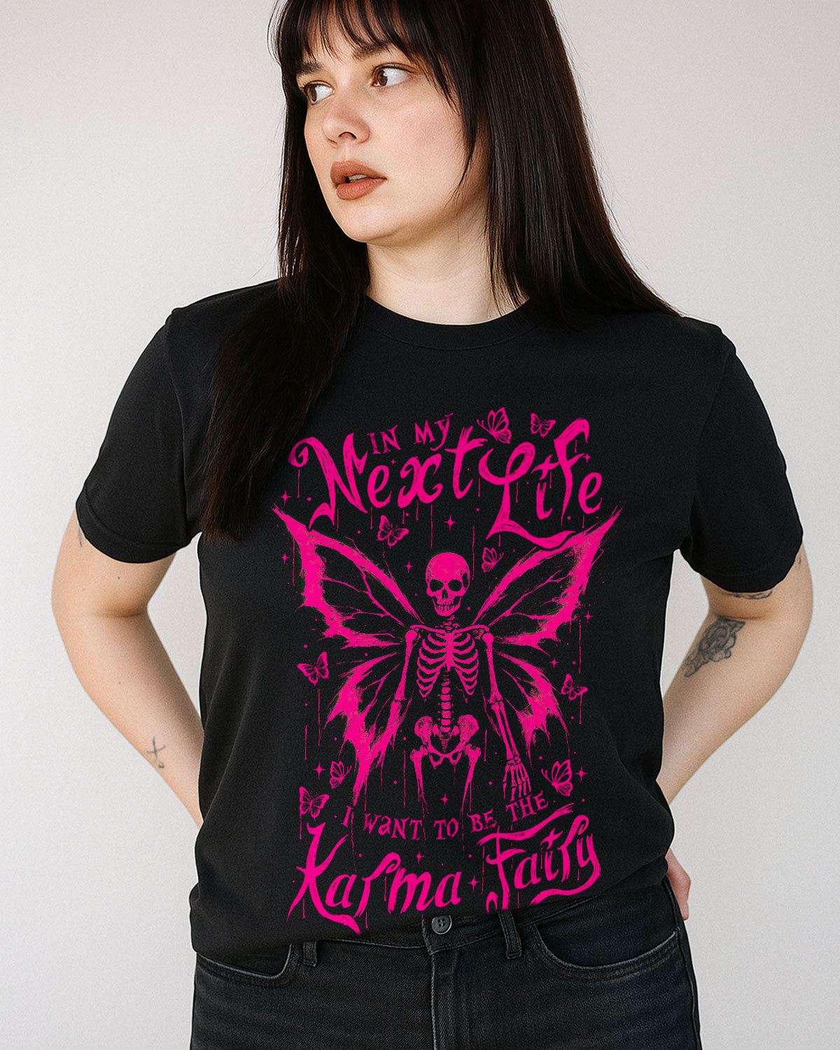 Imagine flying through life with skeletal wings and a wicked smile, sprinkling a little payback where it’s due. This design, blending a fierce skull, delicate fairy wings, and blooming flowers, captures the perfect balance of beauty and retribution. Karma doesn’t knock — it flies straight at you with fire and grace. In the next life, justice will come with a mischievous grin and a touch of floral chaos. Stay fierce, stay fair, and let the wings of karma carry you. 💀🦋🌸