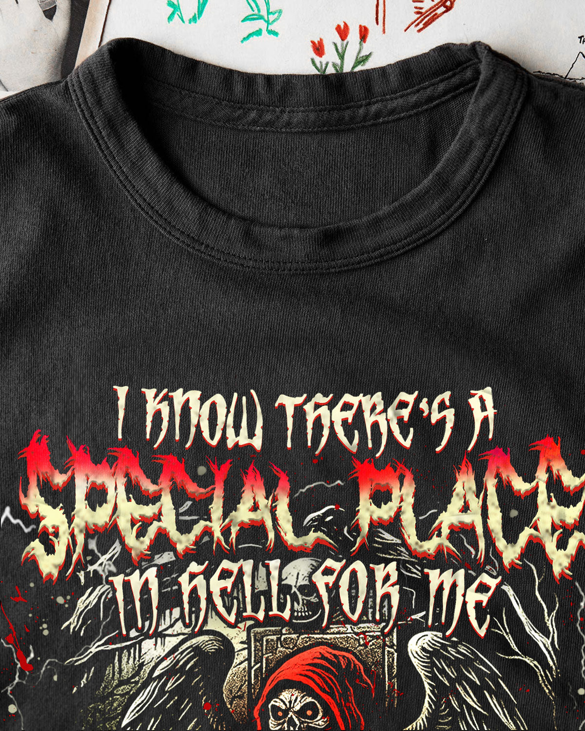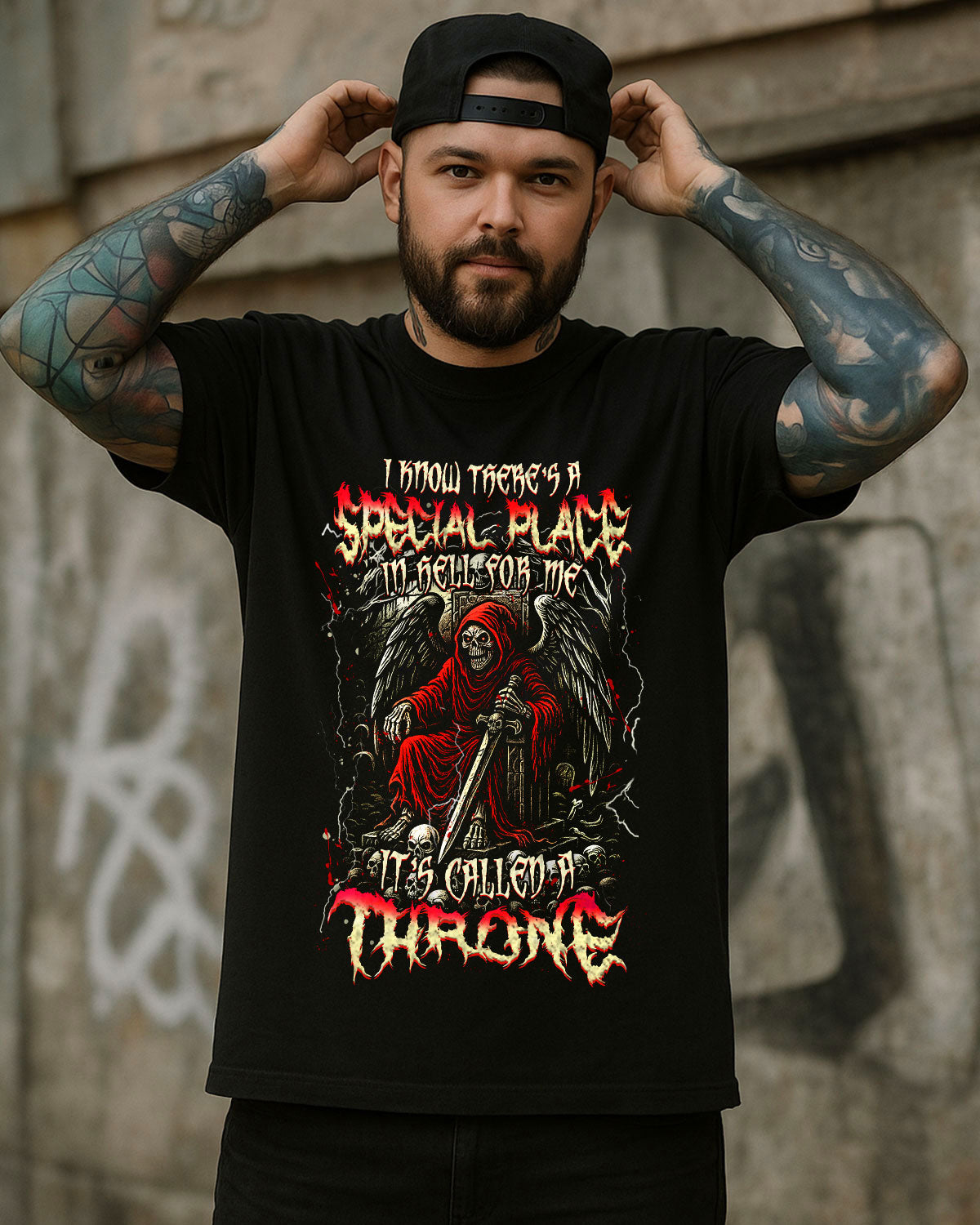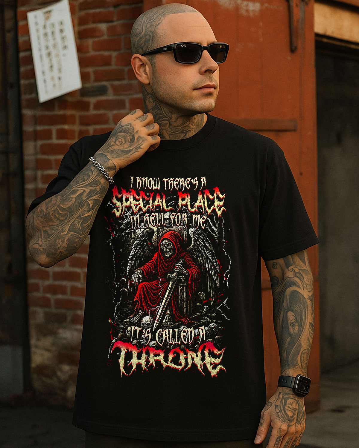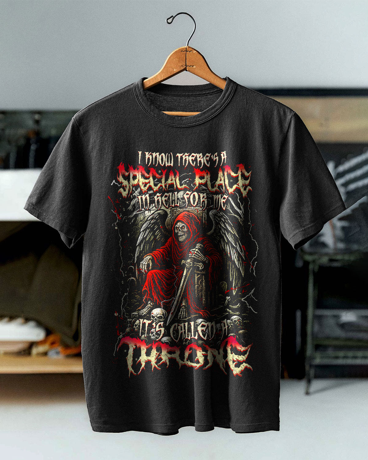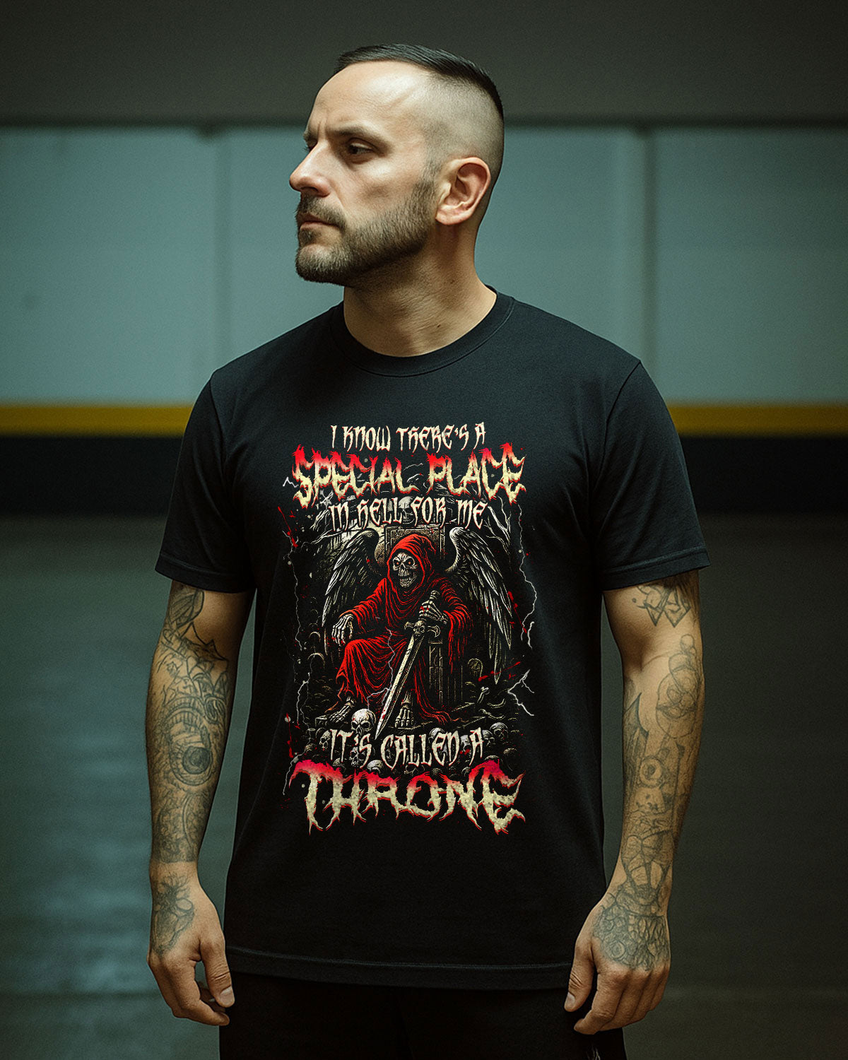 💀 I Know There's A Special Place In Hell For Me ⚡👑 This fierce and unapologetic design showcases a menacing skull reaper seated on a throne forged in fire, sword in hand, surrounded by fallen skulls and violent thunder tearing through the darkness. It’s more...
