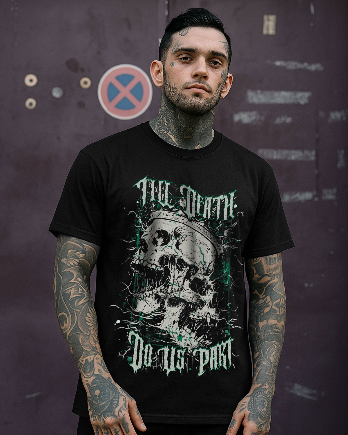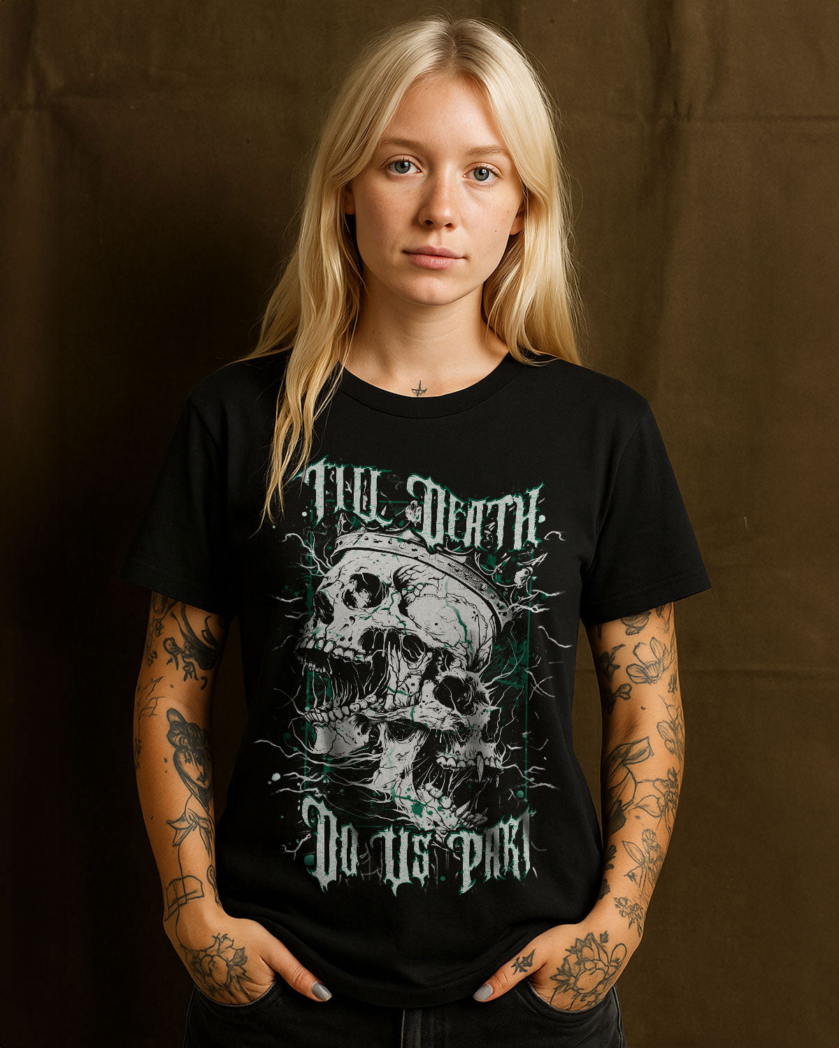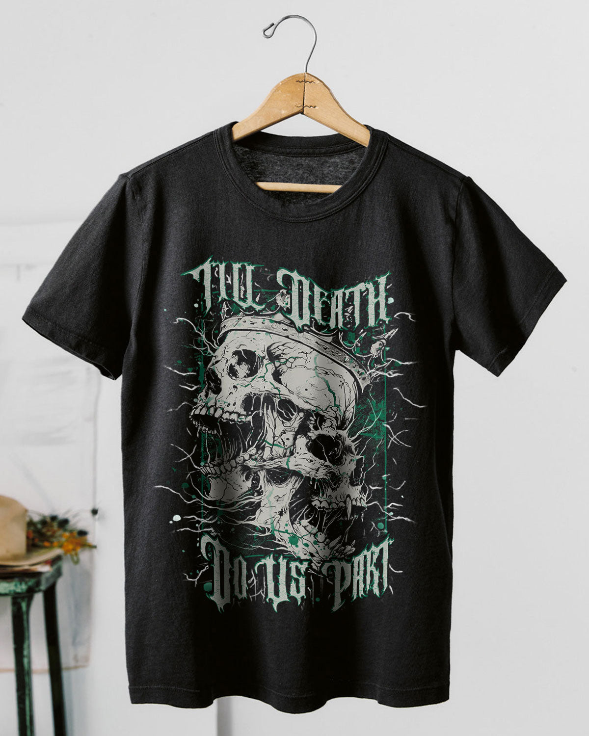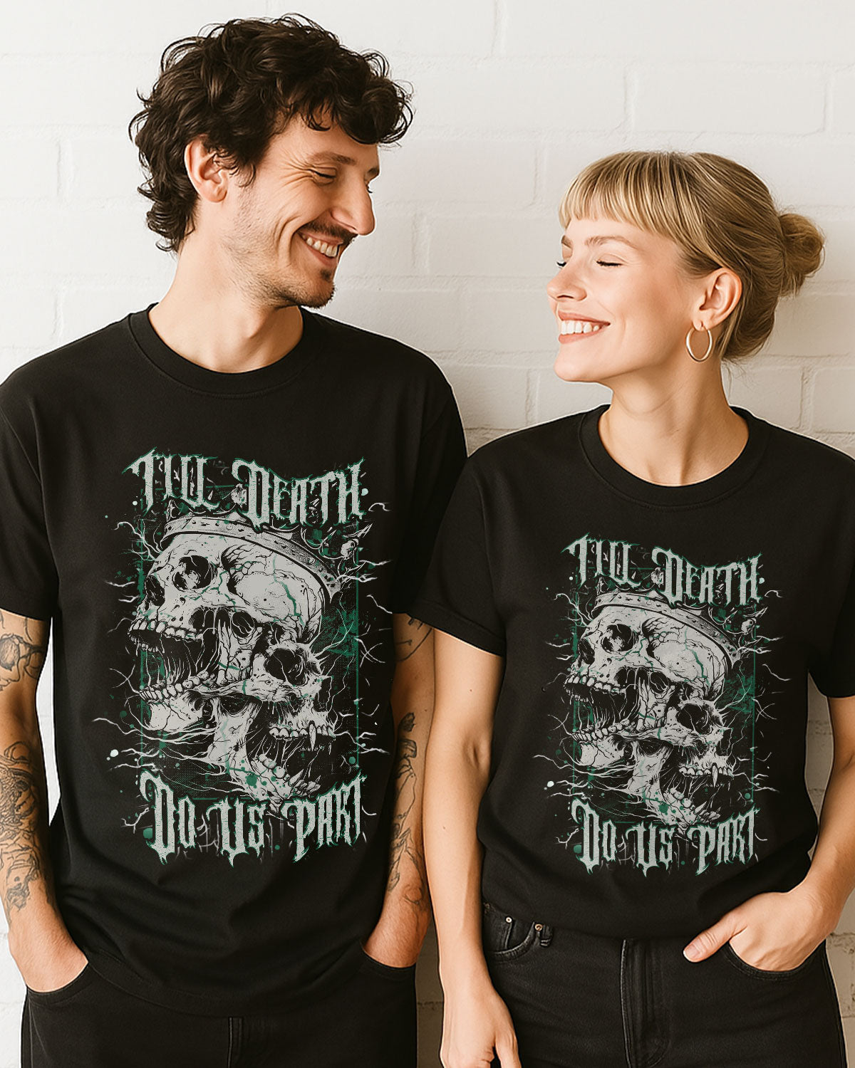 This bold vintage-style artwork features a Skull King and Queen merged into one hauntingly beautiful formโsymbolizing an unbreakable bond that defies time and even death. Surrounded by electrifying thunder lines, itโs a tribute to couples who embrace their dark edge and vow to stay fiercely loyal, no matter what. A perfect piece for those who love hard, ride or die.
