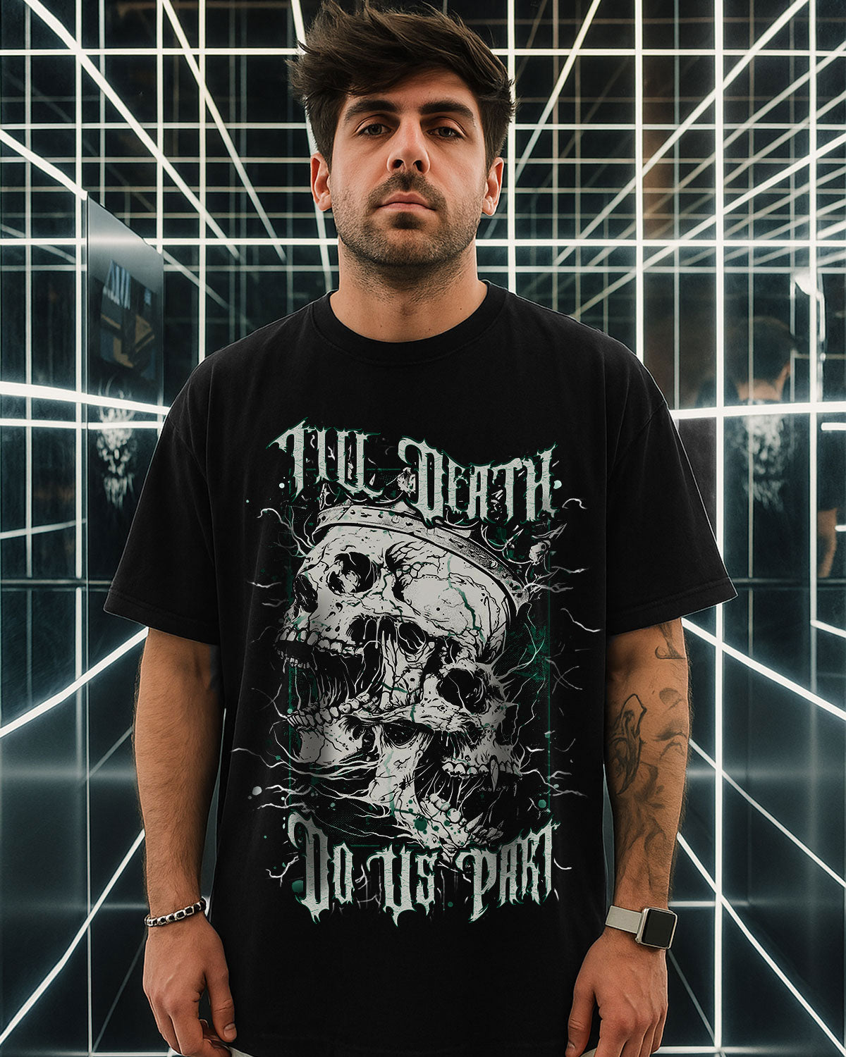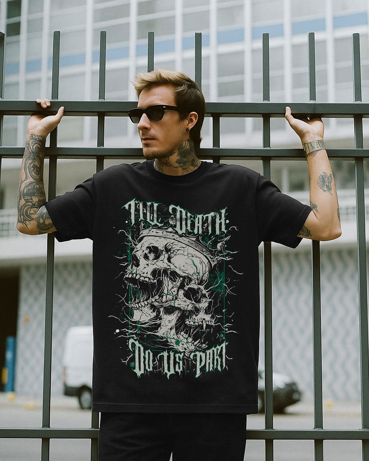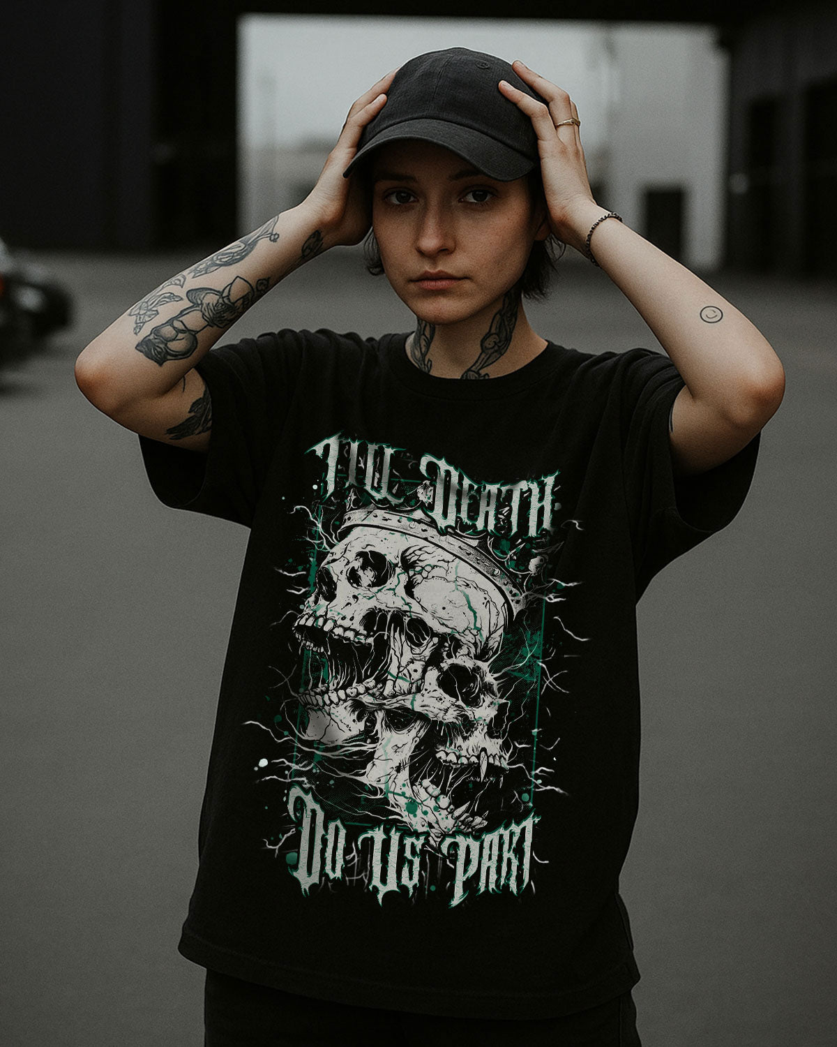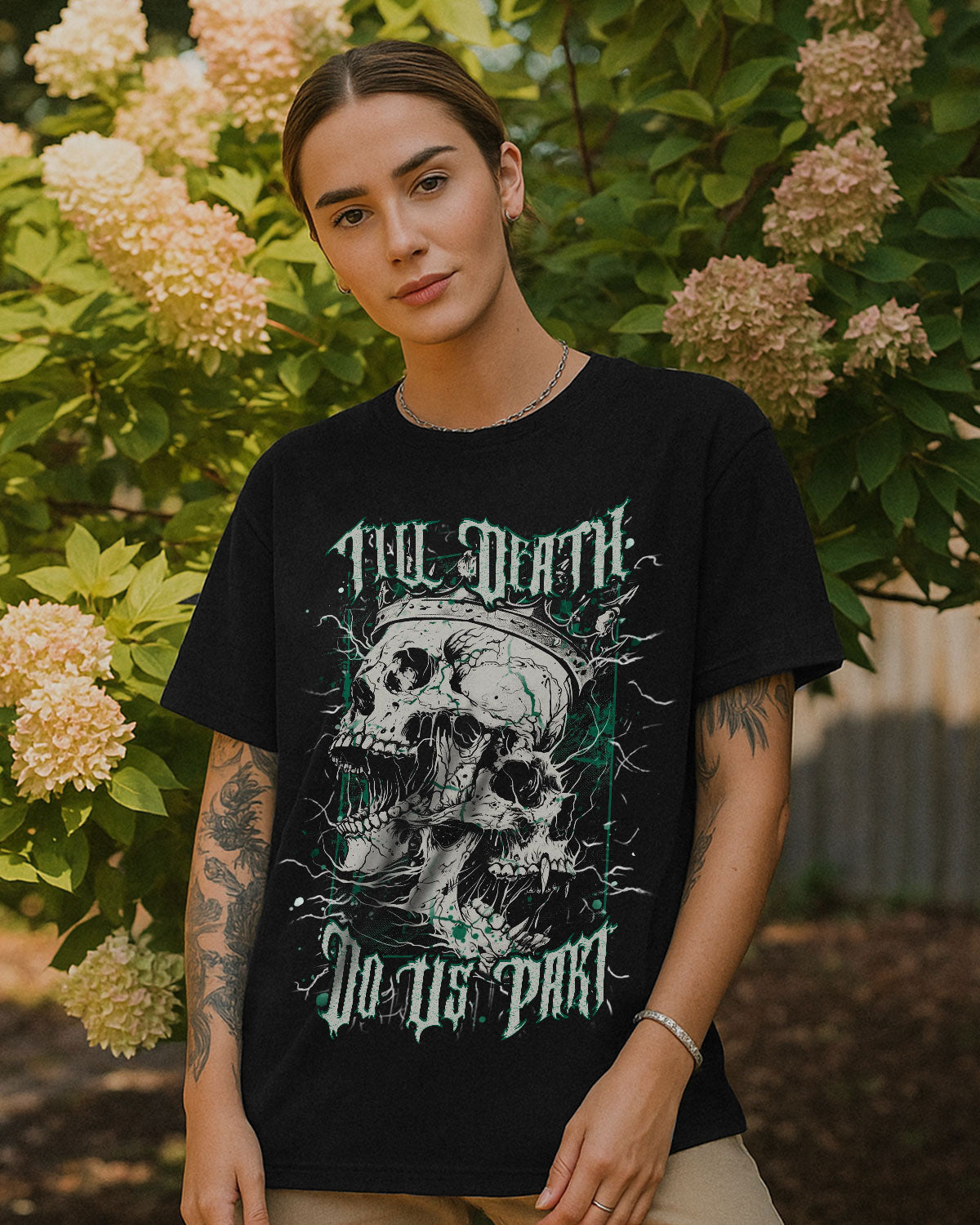 This bold vintage-style artwork features a Skull King and Queen merged into one hauntingly beautiful formโsymbolizing an unbreakable bond that defies time and even death. Surrounded by electrifying thunder lines, itโs a tribute to couples who embrace their dark edge and vow to stay fiercely loyal, no matter what. A perfect piece for those who love hard, ride or die.